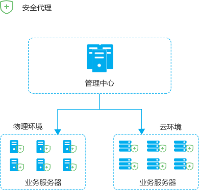 • 該部署模式集中式數據中心,運行模式網絡結構內外網分離、主機設備、網絡拓撲清晰安全管理中心,安全代理端部署在物理機、虛擬機、云環境節點上,實現管理中心對節點的安全管理。