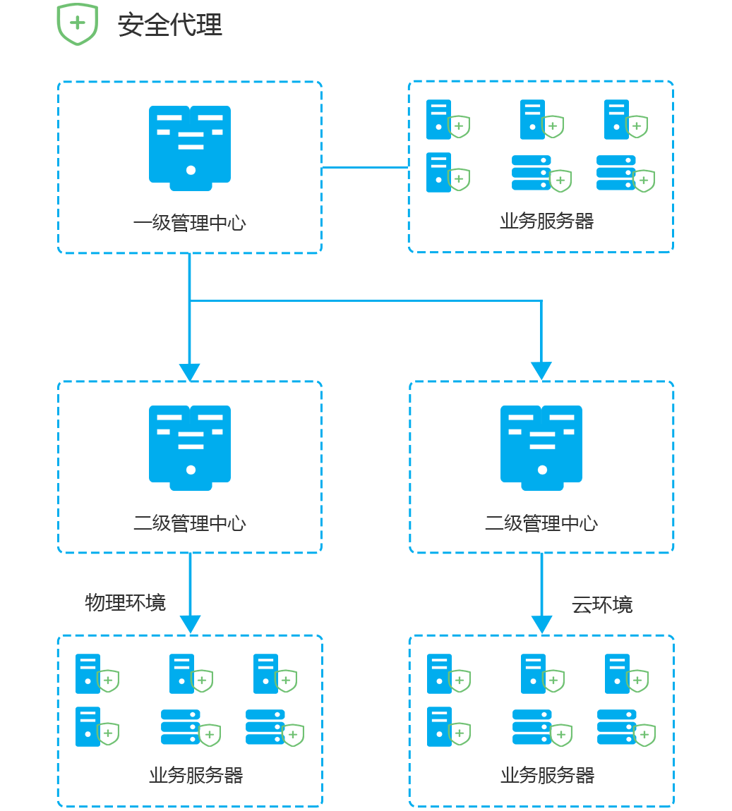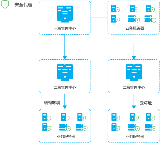 該部署模式針對大型分布式數據中心,此類數據中心運行模式通常具有主機分布于多個物理地點、主機設備較多、網絡拓撲復雜、有多個安全域的劃分等特點。針對此類場景僅需部署一個一級安全管理中心、多個二級管理中心,二級管理中心將數據信息上報一級管理中心,安全代理端部署在物理機、虛擬機、云環境等節點上,實現分布式部署管理中心對全部節點的安全管理。