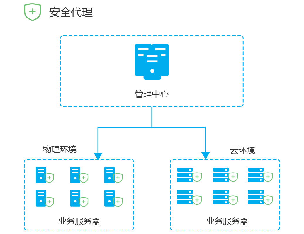 該部署模式針對中小型集中式數據中心,此類數據中心運行模式通常具有網絡結構內外網分離、主機設備相對較少、網絡拓撲比較清晰、僅有數個安全域的劃分等特點。針對此類場景僅需部署一個安全管理中心,安全代理端部署在物理機、虛擬機、云環境等節點上,實現一個管理中心對全部節點的安全管理。