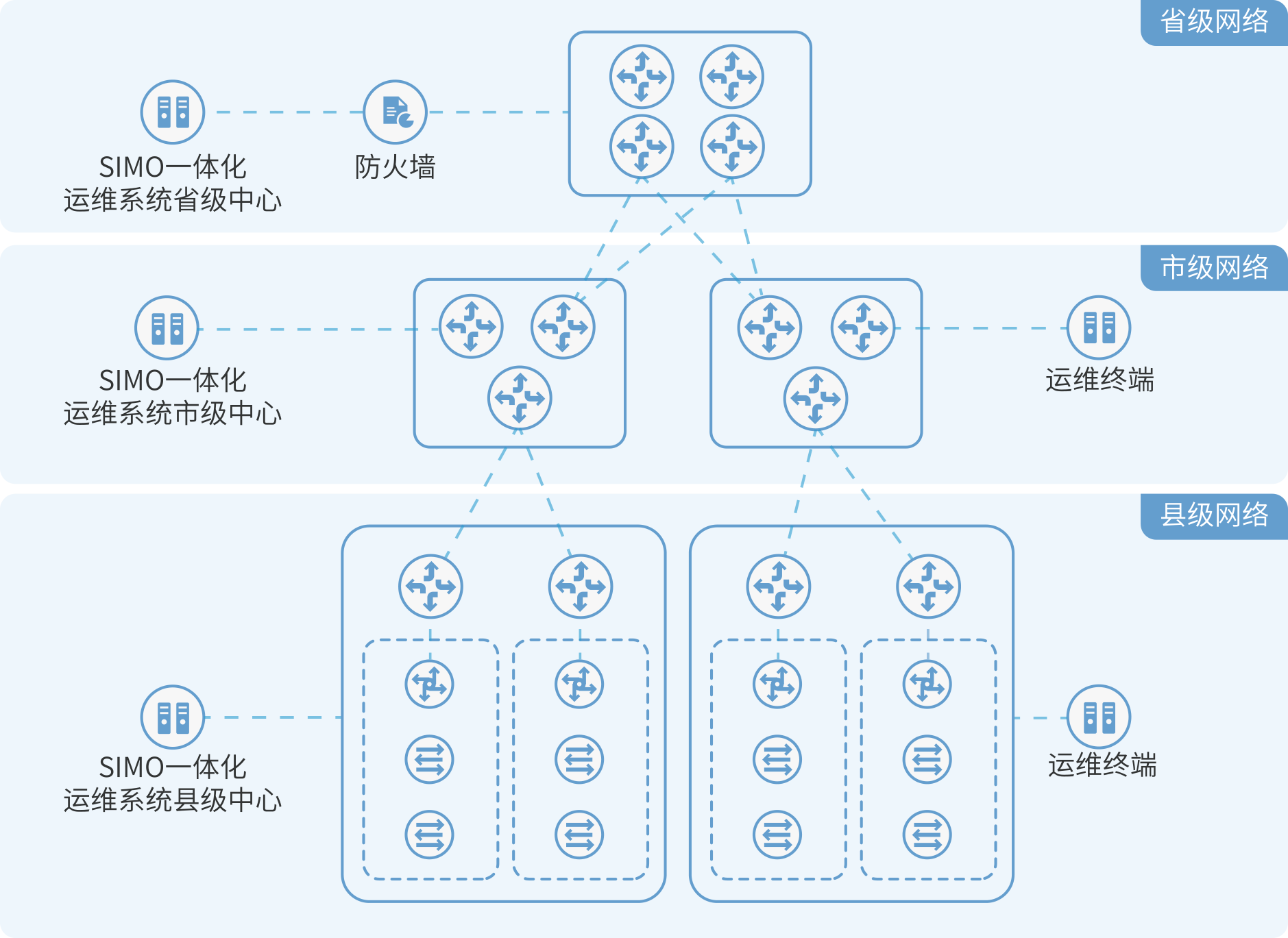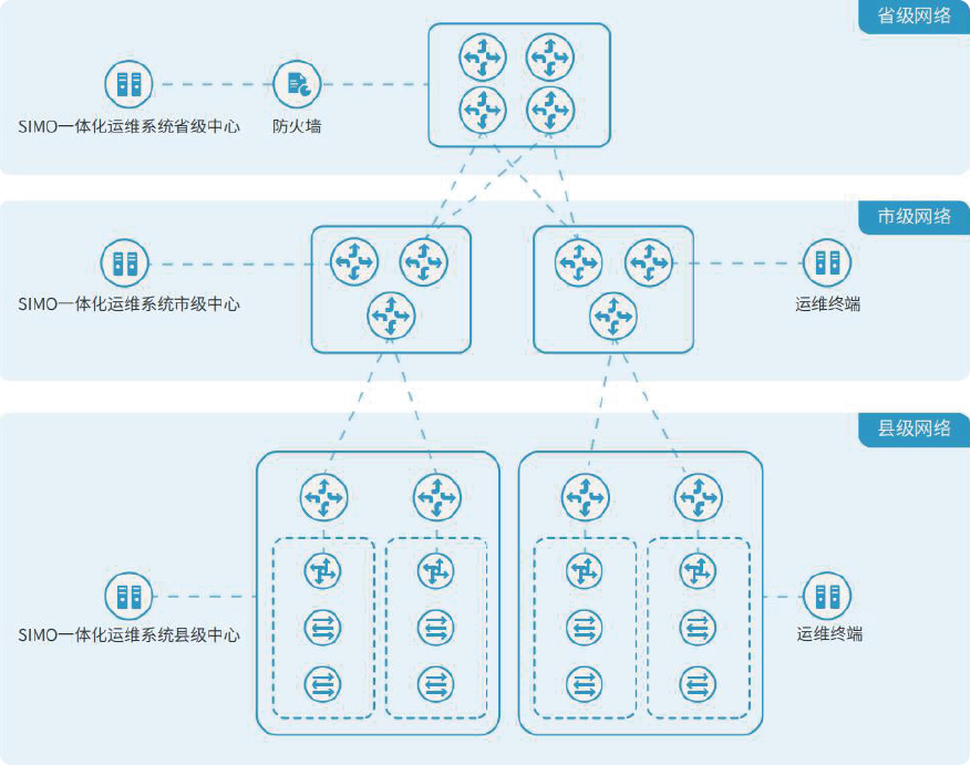 基于“整體規劃、分步實施”的建設原則,逐級實現分布式運維體系。通過分階段建設模式,在構建分級運維管理體系的同時,階段性釋放建設產能,及時優化調整、降低實施風險、保護用戶投資。