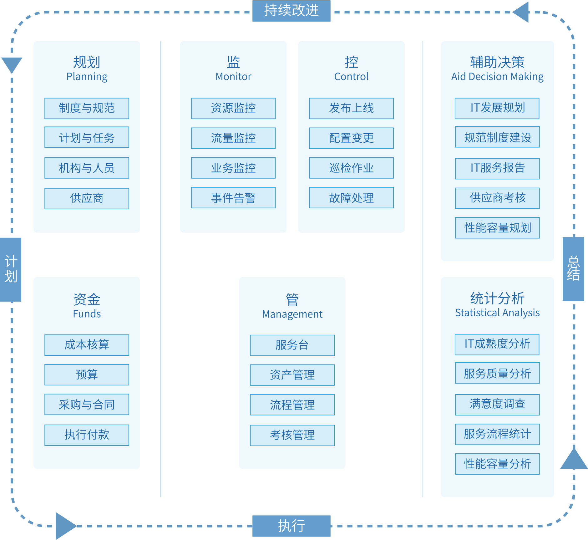 基于ISO20000、ITIL、ITSS等技術服務標準,參考DevOps、Google-SRE模型提供管理咨詢與定制化服務,建立全面的IT運維體系。