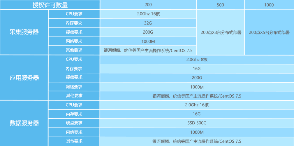 | 其他要求 | 銀河麒麟、統信等國產主流操作系統/CentOS 7.5 | |||